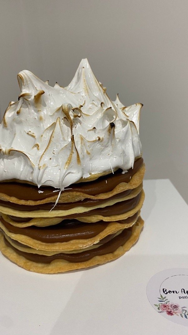 Finas capas de masa rellenas de dulce de leche y decoradas con merengue